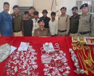 चार आरोपियों को गिरफ्तार कर ₹4 लाख 50 हजार की ज्वेलरी व नकदी जब्त की गई।