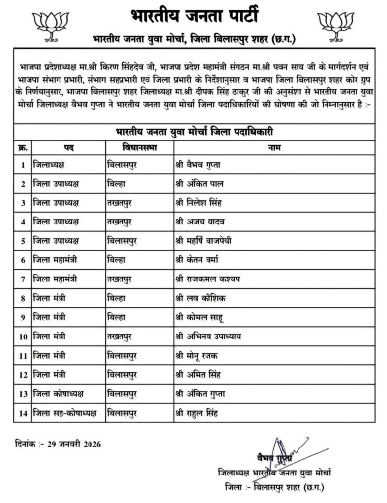 बिलासपुर। भाजपा प्रदेशाध्यक्ष किरण सिंहदेव जी एवं भाजपा प्रदेश महामंत्री (संगठन) पवन साय जी के मार्गदर्शन में, भाजपा संभाग प्रभारी, संभाग सहप्रभारी एवं जिला प्रभारी के निर्देशानुसार तथा भाजपा जिला बिलासपुर शहर कोर ग्रुप के निर्णय के तहत, भाजपा बिलासपुर शहर जिलाध्यक्ष दीपक सिंह ठाकुर की अनुशंसा पर भाजपा युवा मोर्चा के जिलाध्यक्षों की सूची जारी की गई है।